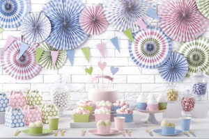 Pastele – nieśmiertelne pastele uzupełnione o żywe odważne kolory, jak słoneczna żółć, czy odcienie fioletu, zestawienie mocy i delikatności w jednym. Take akcenty dekoracyjne można z powodzeniem zestawić w postaci papierowych rozet zdobiących Candy-Bar, czy ściankę do zdjęć.