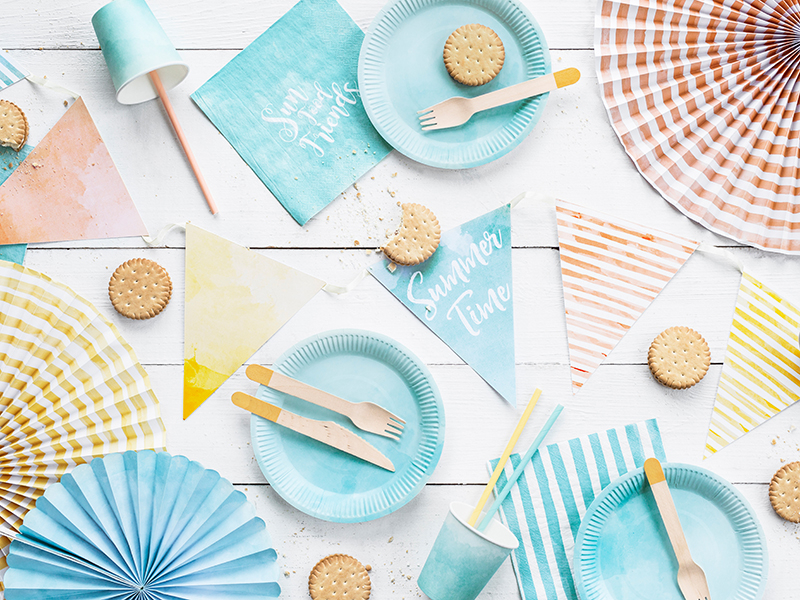 Girlanda na przyjęcie Flagietki Summer Time w odcieniach radosnych pasteli (błękitu, brzoskwini i żółtym) na przyjęcia, urodziny, 18-stki, wesele, dekorację wystawy sklepu. Idealnie pasują do niej rozety papierowe z serii Summer Time.